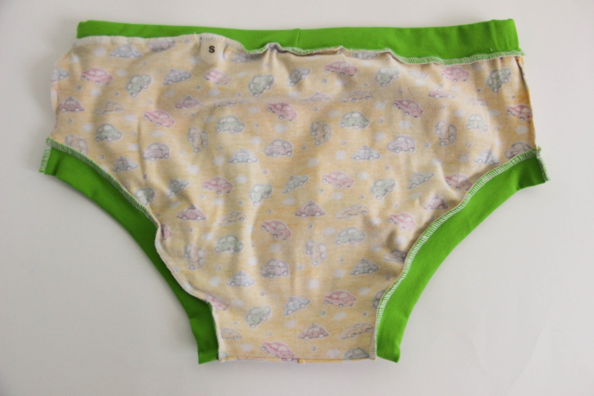 This product is panties for adult men. Comfortable for everyday wear. Elastic band 2 cm (0,8 inches), cotton lining inside. Panties have a window outside and inside. Along the outer seam 12-13 cm (5 inches)