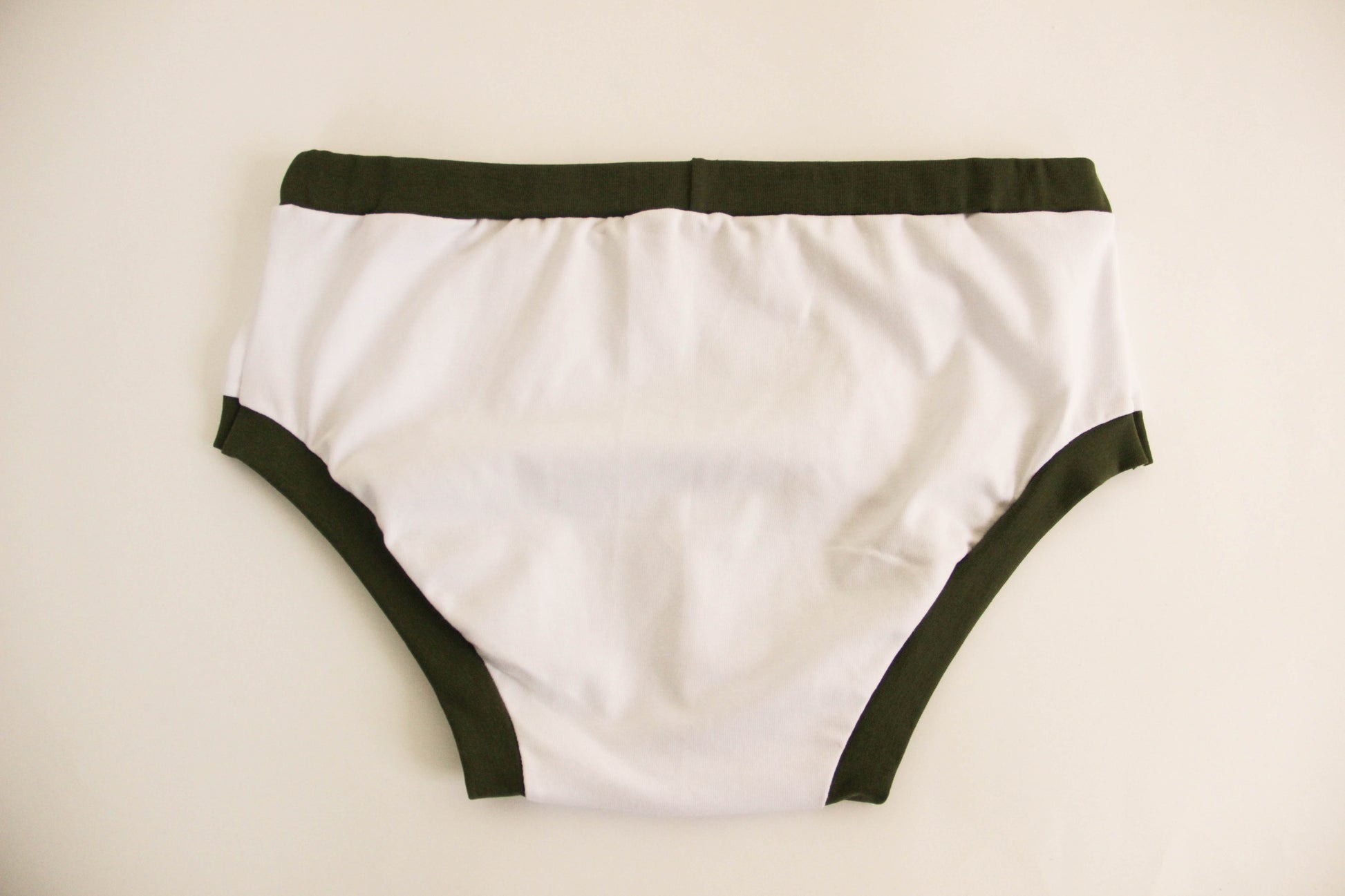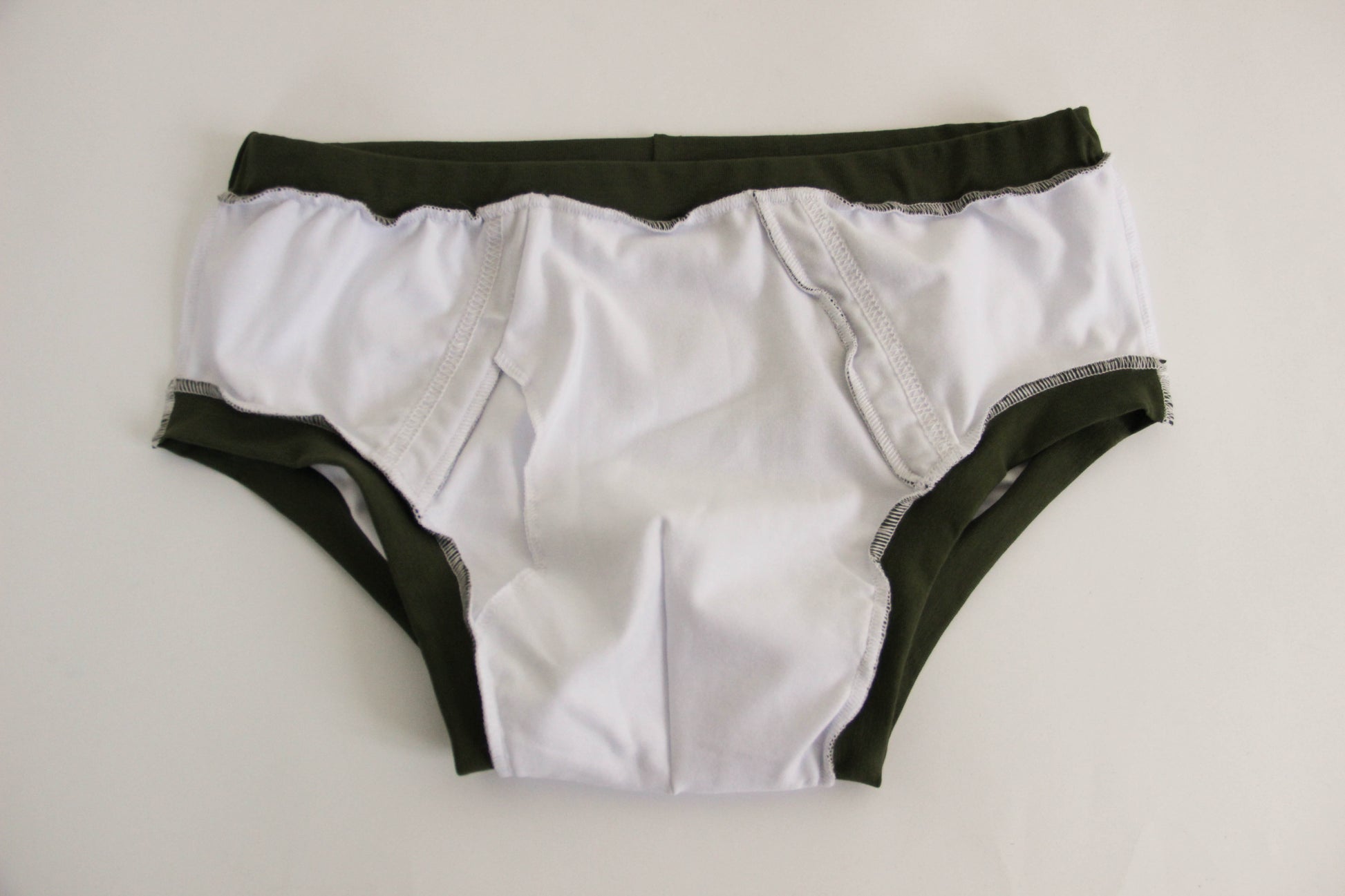 This product is panties for adult men. Comfortable for everyday wear. Elastic band 2 cm (0,8 inches), cotton lining inside. Panties have a window outside and inside. Along the outer seam 12-13 cm (5 inches)