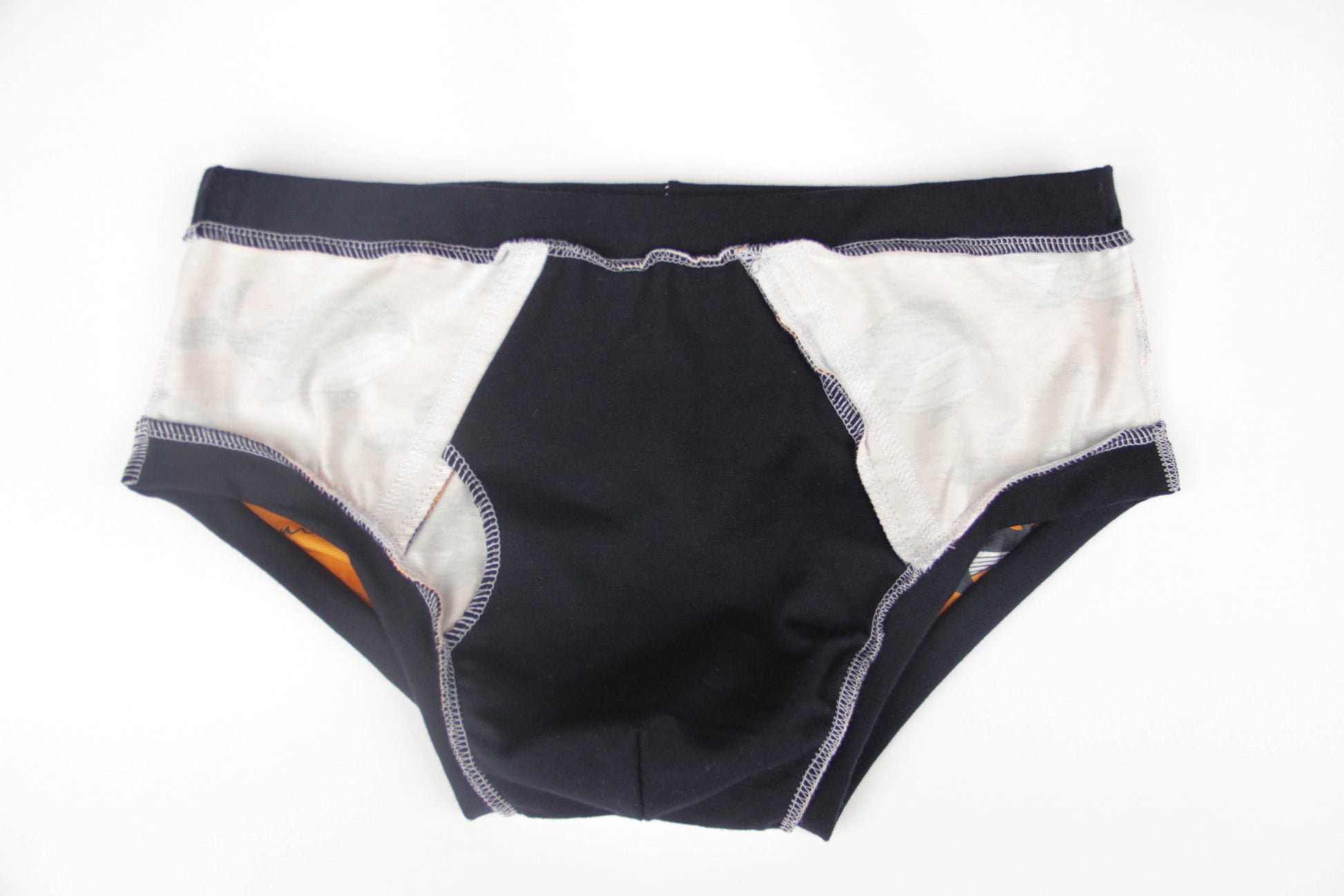 This product is panties for adult men. Comfortable for everyday wear. Elastic band 2 cm (0,8 inches), cotton lining inside. Panties have a window outside and inside. Along the outer seam 12-13 cm (5 inches)